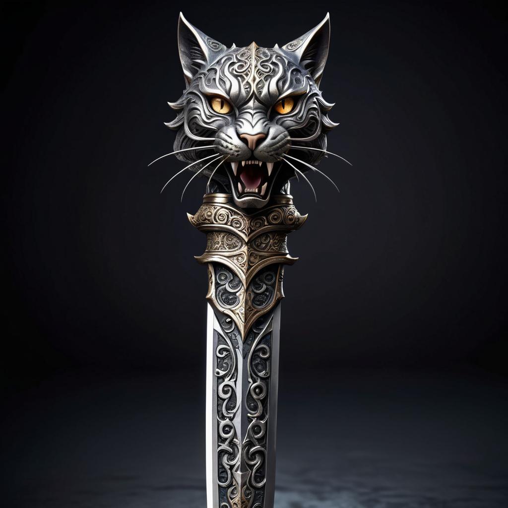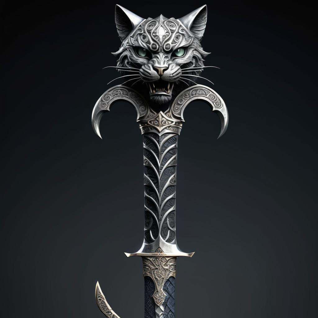 A dark fantasy ancient sword with an ornate metalwork hilt shaped like a fierce cat's head, intricate swirling patterns carved into the blade and handle, gothic design elements, high contrast lighting enhancing the sharp edges and detailed textures, silver and gray color scheme, standing upright against a muted dark background