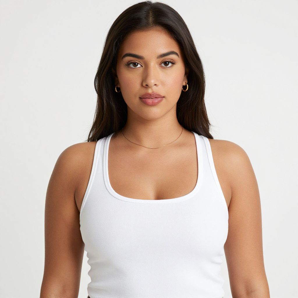 Photograph of a confident young woman with long, dark brown hair, parted to the side, and straightened. She has light brown skin, full lips with light pink lipstick, and dark, well-groomed eyebrows. She's wearing a fitted white tank top that accentuates her slim physique and medium-sized breasts. She has small, gold hoop earrings and a delicate necklace. The background is plain white, highlighting her features.