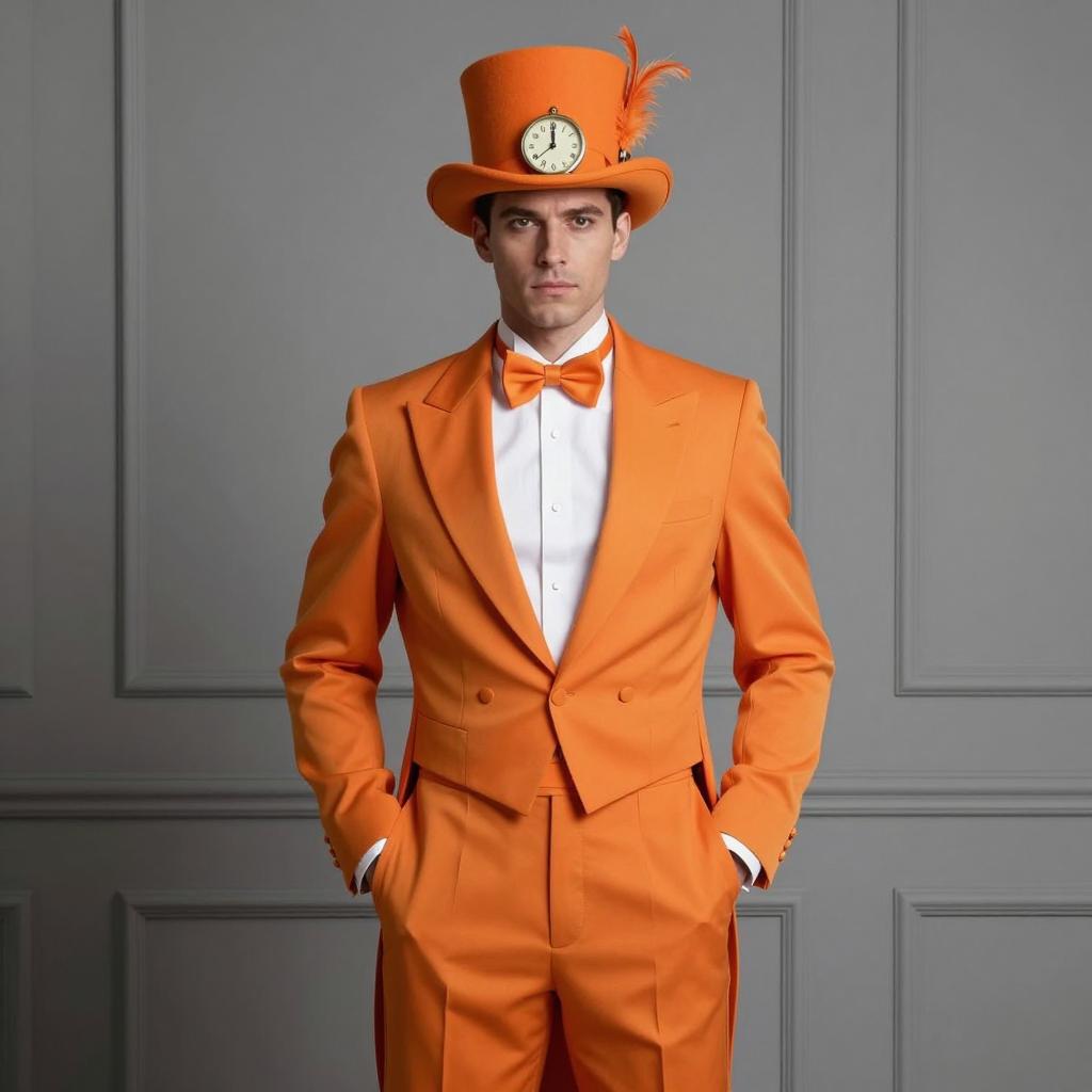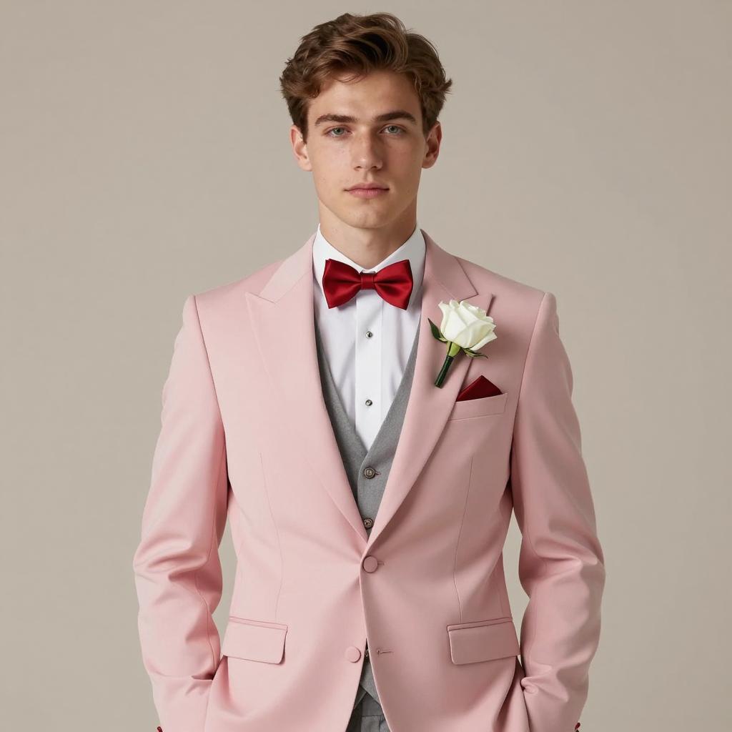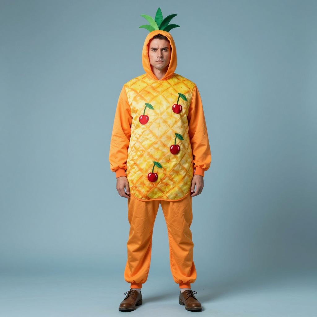 Baby pineapple costume, photorealistic, male model, yellow suit, white shirt, yellow tie, four pineapples attached to chest, spiky blonde hair, serious expression, beige background, fashion photography, surreal, pineapple suit, detailed ures, smooth suit fabric, realistic pineapples, sharp pineapple spines, symmetrical layout, modern style, studio lighting, front view