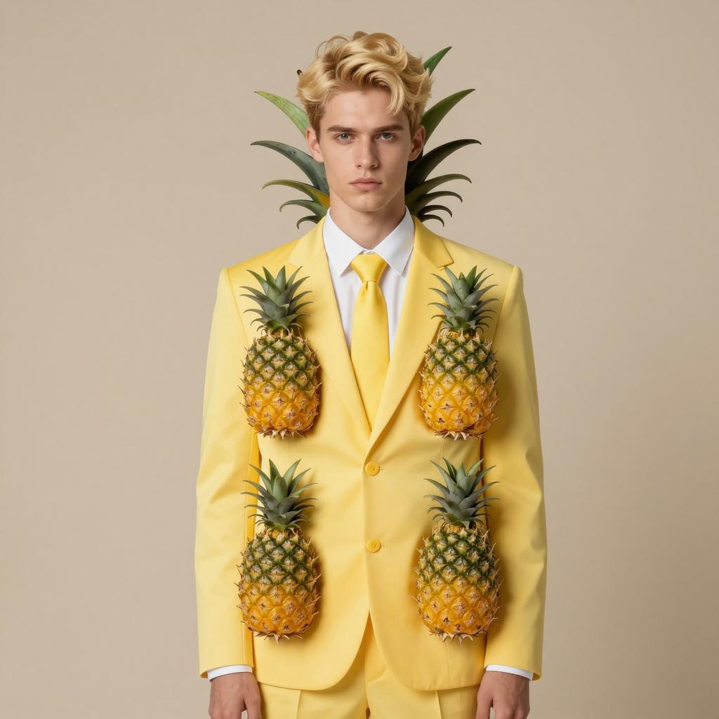 A young male model with spiky blonde hair and a serious expression wearing a bright yellow suit, white shirt, and yellow tie. The suit features four realistic pineapples symmetrically attached to the chest area. The background is beige, and the image is captured with studio lighting in a photorealistic fashion photography style.