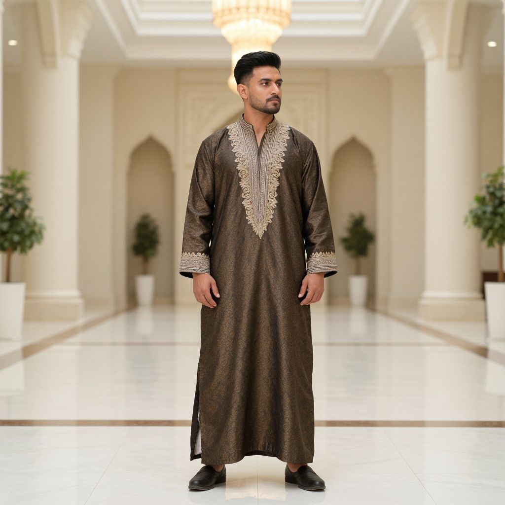 Kaftan Stylish Costume, man in traditional clothing standing in a large building