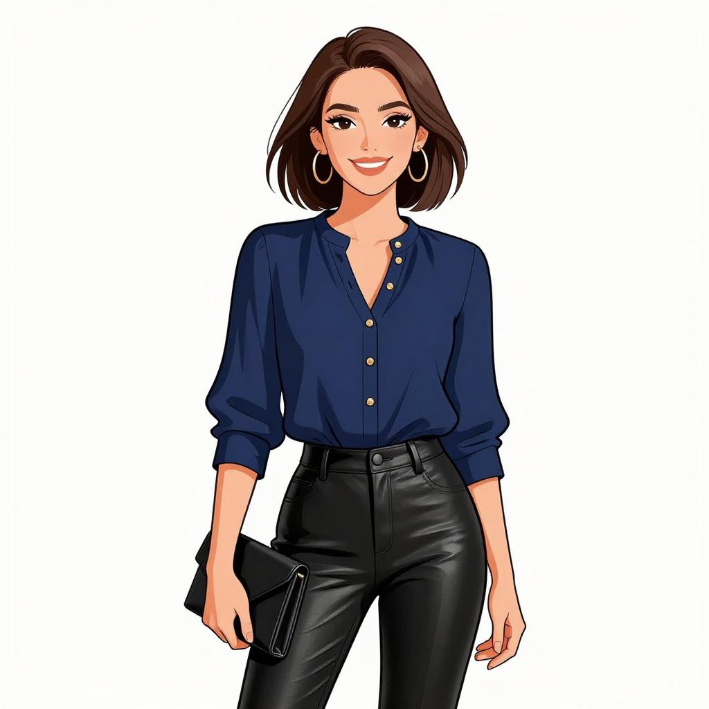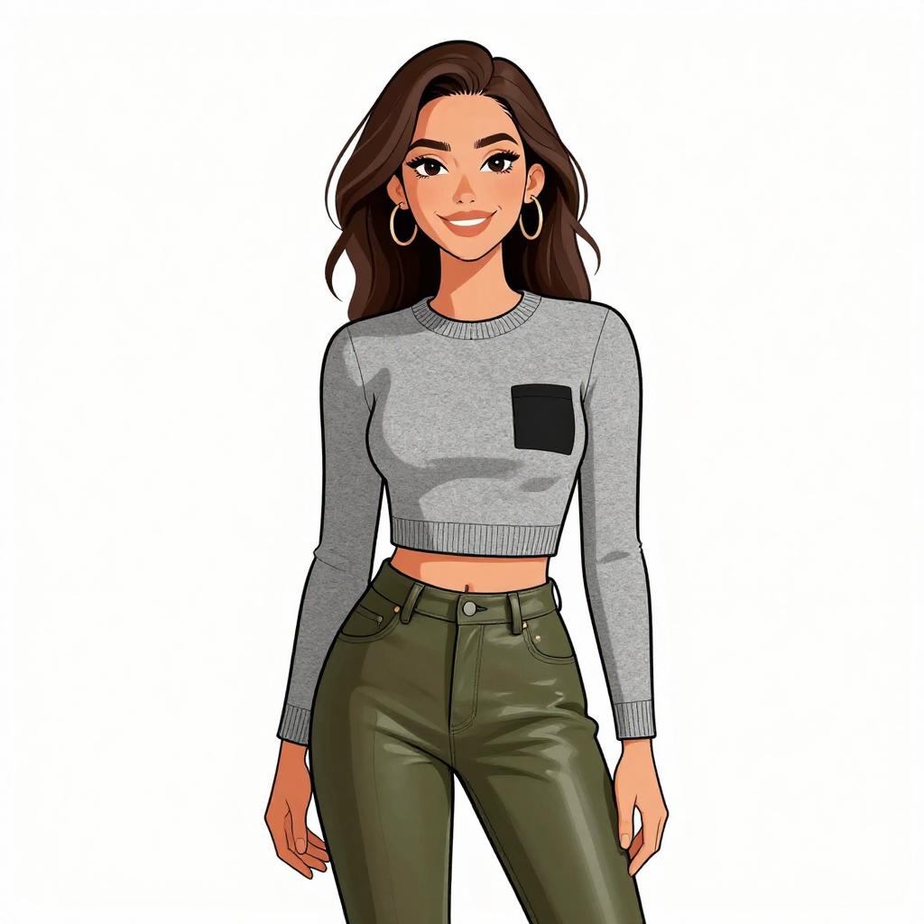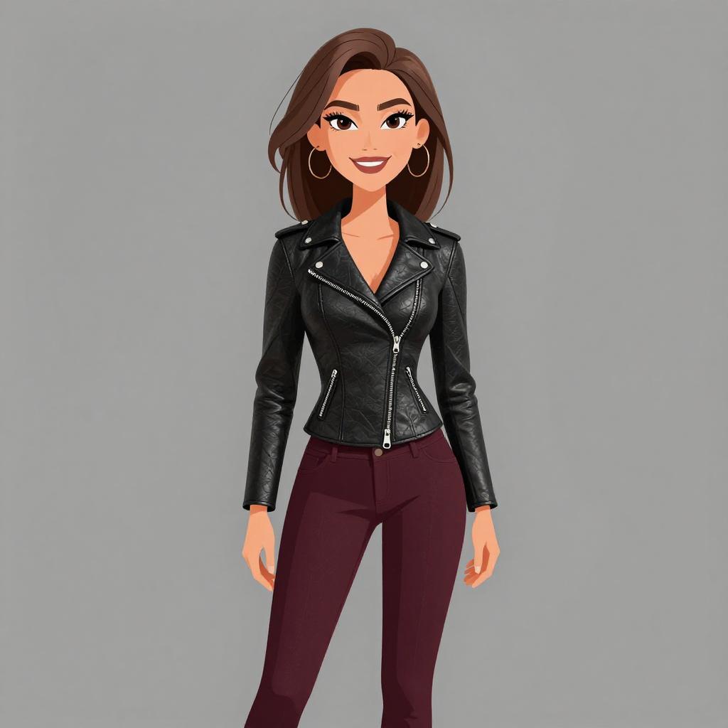 Woman with pretty face and pretty hair. smiling Woman, business casual, marled grey lightweight cardigan with waterfall front, long sleeves, white V-neck blouse, tucked into burgundy faux leather pants, slim fit, metallic pendant necklace. --sref 1467