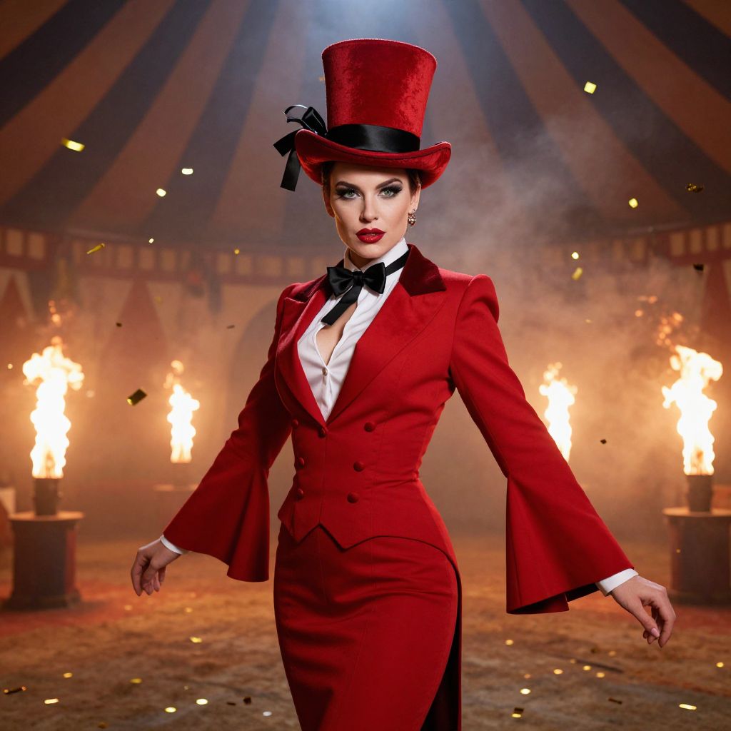 A fierce and elegant Ringmaster lady with a strong jawline, piercing green eyes, and a bold red lipstick, clad in a fitted red tailcoat with flared sleeves and a red velvet top hat decorated with black ribbons, standing in a foggy circus tent during a night show, surrounded by glowing confetti and fire effects, the spotlight highlighting her commanding presence