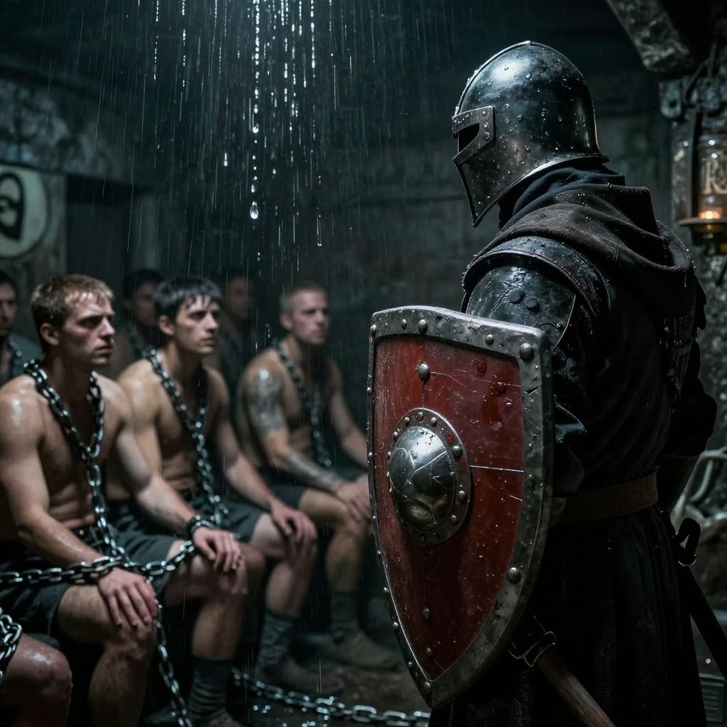Photograph in a dark, moody style depicting a medieval scene. A knight in shiny, wet armor with a helmet and a red shield stands in the foreground, facing a group of shirtless, muscular men with chains around their necks and wrists, seated in the background. The men, with varying skin tones and tattooed arms, look up at the knight with serious expressions. Water is falling from above, adding a dramatic effect. The dimly lit, stone-walled room has a grim, oppressive atmosphere with faint torchlight visible on the right. The knight's reflective armor contrasts with the matte textures of the men's skin and chains.