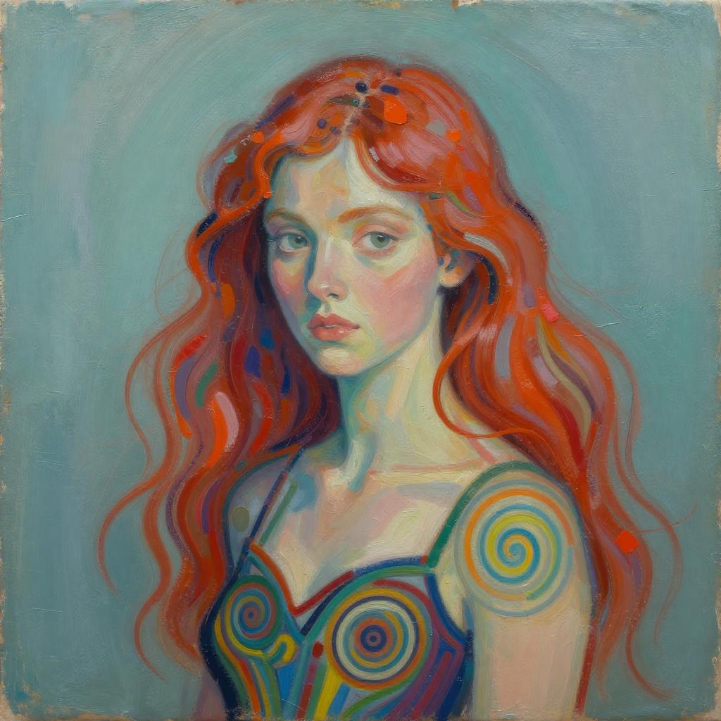 Digital painting of a fair-skinned woman with vibrant red wavy hair, wearing a colorful, spiral-patterned dress, against a blue background.