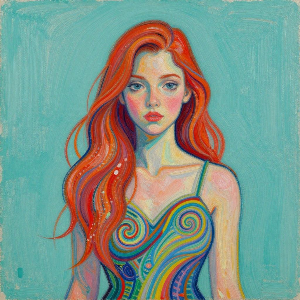 A vibrant, digital painting in a modern, impressionistic style depicts a young woman with long, wavy, bright red hair. Her pale skin contrasts with her colorful, swirl-patterned, sleeveless top in shades of blue, yellow, and green. The background is a soft, gradient blue. She has delicate features, light blue eyes, and a slightly melancholic expression. The texture of the painting is smooth with visible brushstrokes, adding depth and movement to her hair. The overall composition focuses on her upper body, emphasizing her ethereal and dreamlike appearance.