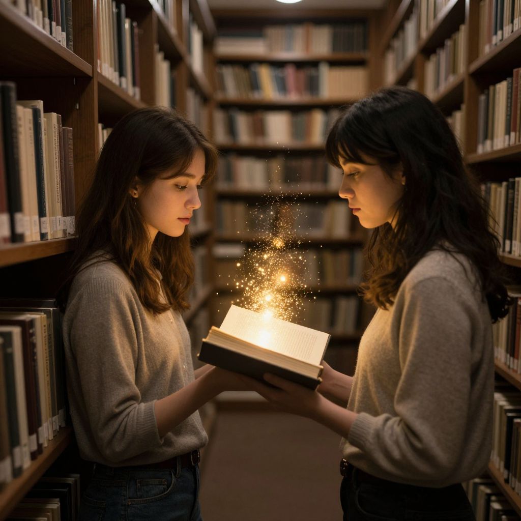 Glowing golden particles emerge from an open book held by a young woman in a dimly lit library, creating a luminous bridge between her and another person as they stand amidst rows of wooden bookshelves filled with countless volumes.