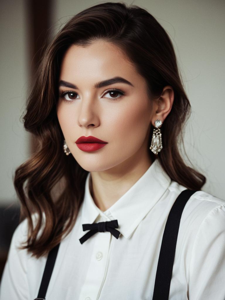 Woman suspenders outfit, 1girl, solo, suspenders, looking at viewer, shirt, earrings, brown hair, jewelry, white shirt, realistic, blurry background, blurry, upper body, red lips, lips, collarbone, parted lips, long hair