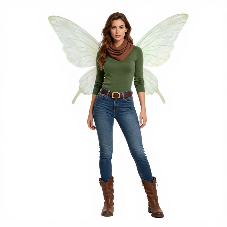 Photograph of a young woman standing against a white background with translucent fairy wings. She has long, wavy brown hair and wears a fitted olive green long-sleeve top with a brown scarf, blue skinny jeans, and brown leather boots with buckles. Her belt matches the scarf. Her wings, semi-transparent and delicate, are positioned behind her, adding a magical element. She has a neutral expression and stands with her arms relaxed by her sides. The image has a clean, studio-like quality with sharp focus and bright lighting.