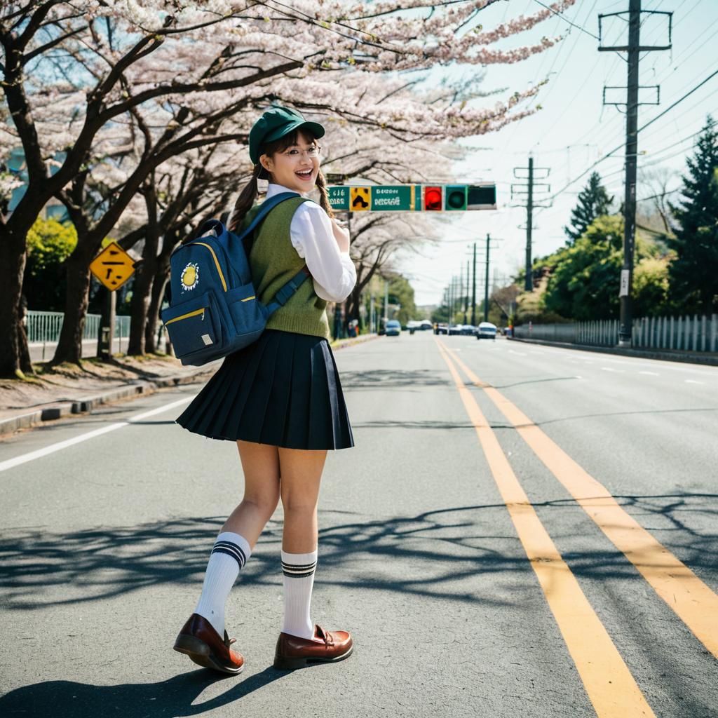 Photograph of a smiling Japanese schoolgirl in a green vest, black skirt, white socks, and brown loafers, walking on a sunny, cherry
