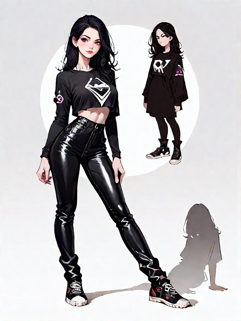 1girl, source_comics, realistic face, full body shot, Woman, edgy, cropped graphic t-shirt in black and white, crew neck, short sleeves with black trim, black faux leather pants, high-waisted, skinny fit, carrying a black leather biker jacket, zippers, snap buttons, notched lapel collar.