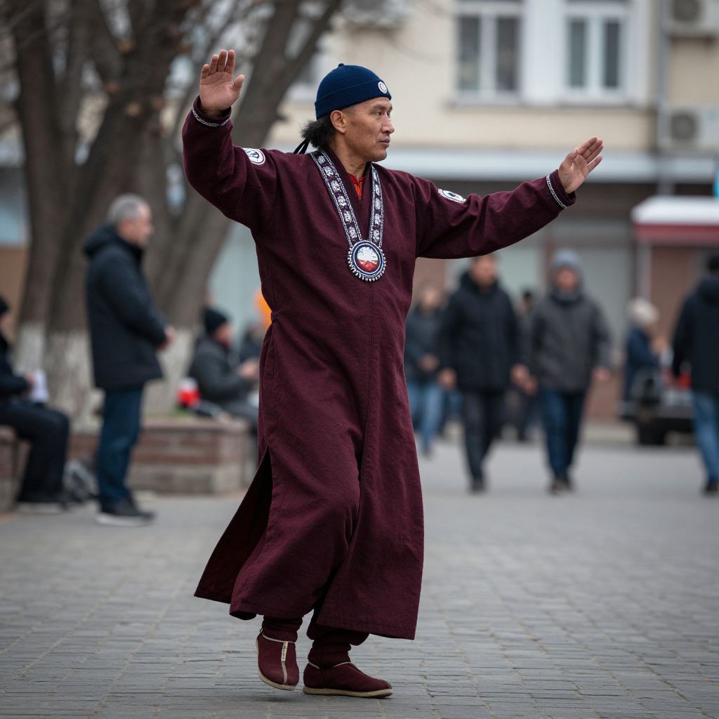 A candid street photograph in rich burgundy and deep blue tones, capturing a Siberian shaman in spontaneous motion, The image focuses on realistic details and expressive poses, utilizing soft muted tones and atmospheric lighting, The elegant composition and urban scene create a serene ambiance with a timeless quality