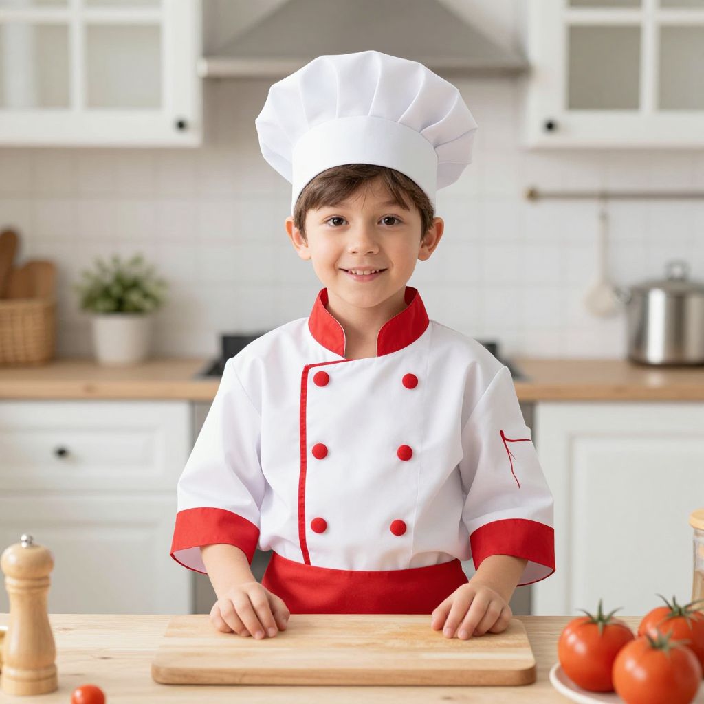 Photograph of a young boy in a white chef's uniform with red buttons and trim, and a tall white chef's hat. He has short brown hair and a slight smile, standing in a modern kitchen with white cabinets and a wooden countertop. He is holding a wooden cutting board with both hands. In the background, there are a silver pot, a potted plant, and a pepper grinder on the counter. Tomatoes are on the right side of the counter. The kitchen has a bright, clean, and organized appearance.