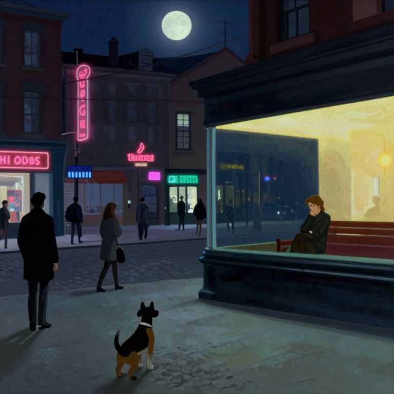Create an image in the enigmatic style of Hopper-esque nocturnal scenes, depicting a lively city street from a unique vantage point as if observed by a wandering canine. This perspective should blend the realism characteristic of Hopper's art with elements evocative of vintage Disney animation, capturing both a sense of nostalgia and modernity. Illuminate the scene with neon lights casting an otherworldly glow on the cobblestone path, emphasizing the dichotomy between vibrant activity and solitude. Feature a solitary figure seated on a bench, engrossed in their thoughts under the gentle moonlight, while silhouettes of passersby contribute to a dynamic ambiance of urban life.