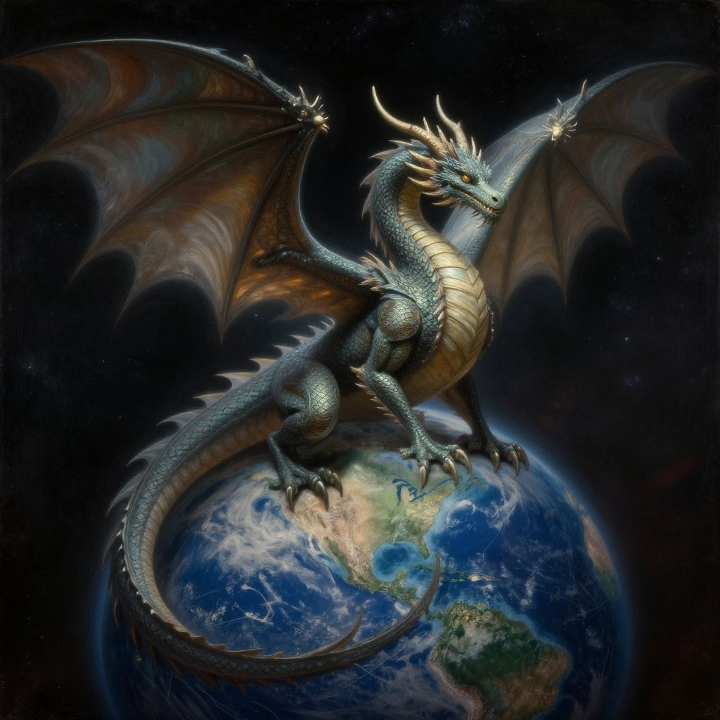 A mythical dragon hatching out of planet Earth in space, art deco painting, pretty and hyper detailed, ethereal, fantasy, cinematic, 8k, Moody, ultra realistic