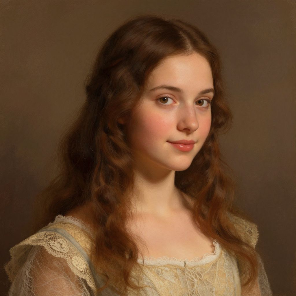 Digital portrait of a young woman with long, wavy brown hair, fair skin, and delicate features, wearing a lace-trimmed, sheer top