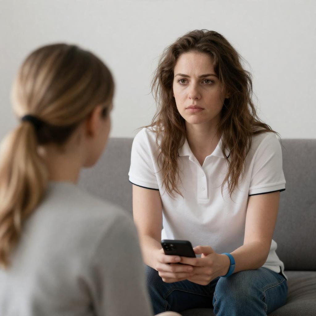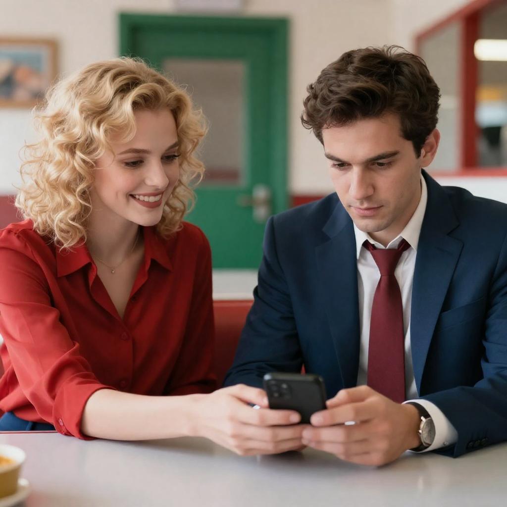 Photograph of a man with short blond hair, wearing a white shirt, leaning over a woman with short curly brown hair, wearing a patterned hospital gown, holding a black phone. They are in a hospital room, with a light fixture and vent on the white wall behind them. The man looks focused, while the woman looks at the phone intently. Blue blanket covers the woman.