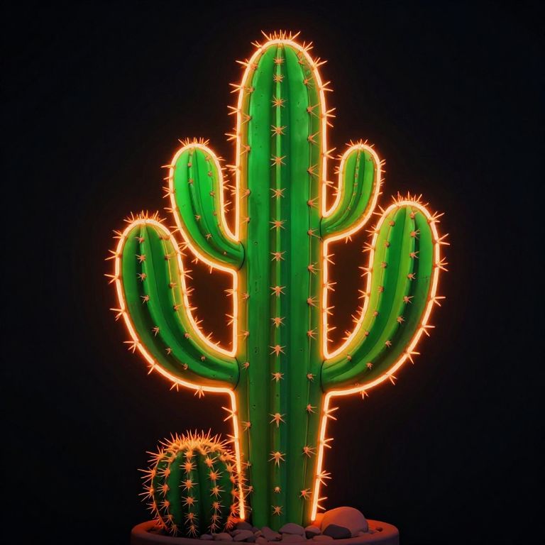 The image features a striking neon outline of a cactus, glowing with vibrant green and orange hues against a dark background. The cactus has a tall, slender stem with several large, flat, green pads extending outward, each adorned with small, sharp spines. A smaller, round cactus is nestled at the base, adding to the overall complexity of the scene. The neon lines are meticulously drawn, creating a sense of depth and dimension, with the green pads appearing more illuminated and the orange spines casting a warm glow. The composition is balanced, with the cactus centrally positioned, drawing the viewer's eye to its intricate details. The interplay of colors and the neon outline gives the image a modern, artistic feel, making it visually captivating.
