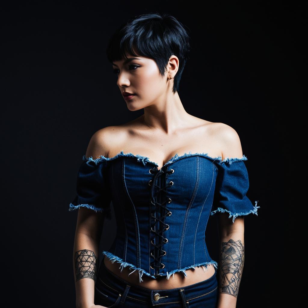 Attractive woman with huge boobs wearing off-the-shoulder lace-up front denim corset crop top with frayed neckline in soft pastel blue denim on tattooed woman with short brown bob and striking green eyes posed tilting her head slightly down with eyes looking up at the camera in plain dark background for dramatic contrast, soft natural window light, intimate modern portrait fashion photography, high resolution, ultra-detailed