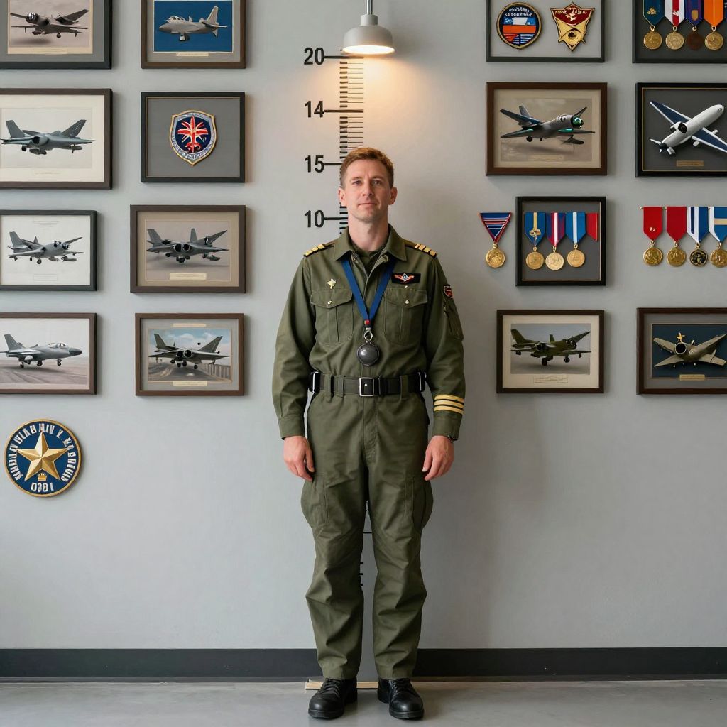 Fighter pilot height focus showcasing a pilot measuring their height against a wall filled with aviation achievements, flight patches, and medals, ambient lighting, photorealistic textures, modern military hangar setting