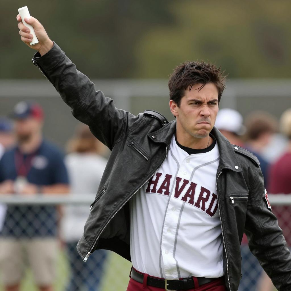 Man with short dark hair, wearing a black leather jacket over a white and black baseball-style shirt with "Harvard" , raises his right hand holding a white object, standing behind a chain-link fence. Blurred background with green trees and people. Intense facial expression. Mid-action pose.