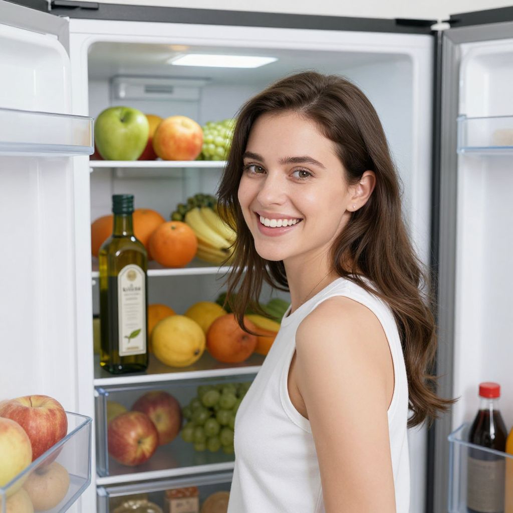 Woman smiling brightly in front of an open refrigerator, showcasing a neatly organized interior with fresh fruits on the top shelf, a bottle of olive oil on the middle shelf, and additional items visible below.