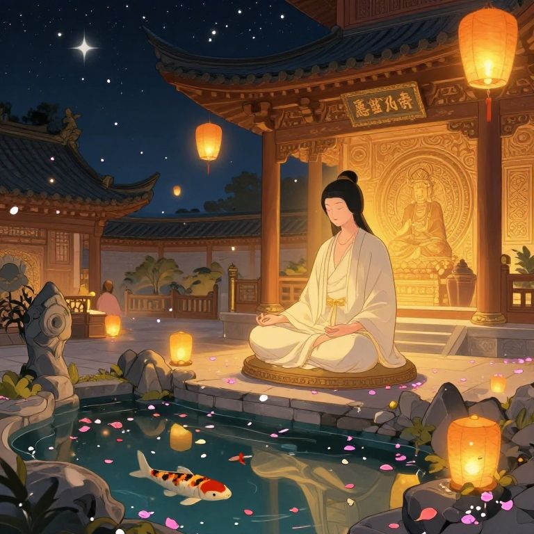 Digital illustration of a serene nighttime scene in an East Asian temple courtyard. A calm Asian woman with long black hair, dressed in a white robe, sits cross-legged on a stone platform by a small, glowing koi pond. Lanterns float on the water, surrounded by colorful koi fish, and pink petals drift on the surface. The background features ornate, illuminated temple architecture with traditional curved roofs and a large, golden Buddha statue. The night sky is dark, dotted with stars, and additional lanterns illuminate the courtyard. The overall atmosphere is peaceful and spiritual.