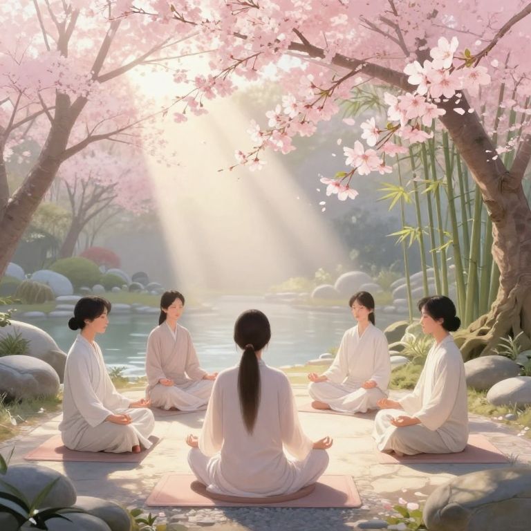 Digital illustration of a serene Asian woman in a white robe meditating by a lantern-lit pond with koi fish, surrounded by traditional temple architecture at