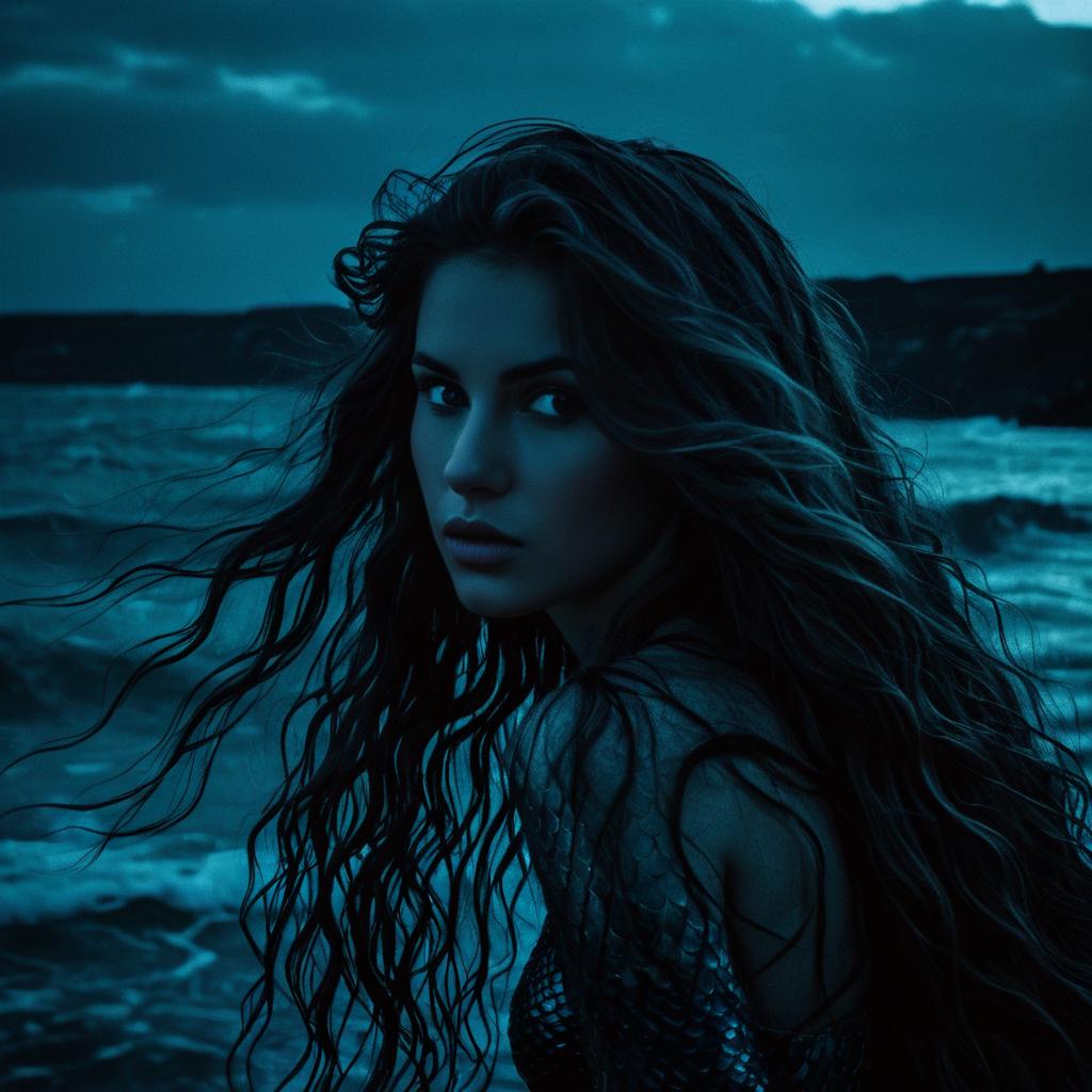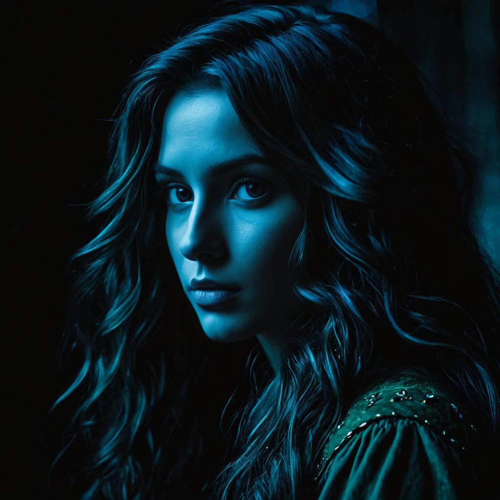 Close-up portrait of a female elf with flowing wavy hair and glowing eyes, illuminated by dramatic atmospheric lighting in a night scene. The image features rich jewel tones and detailed, surreal eye highlights, enhancing the mystical and enigmatic mood.