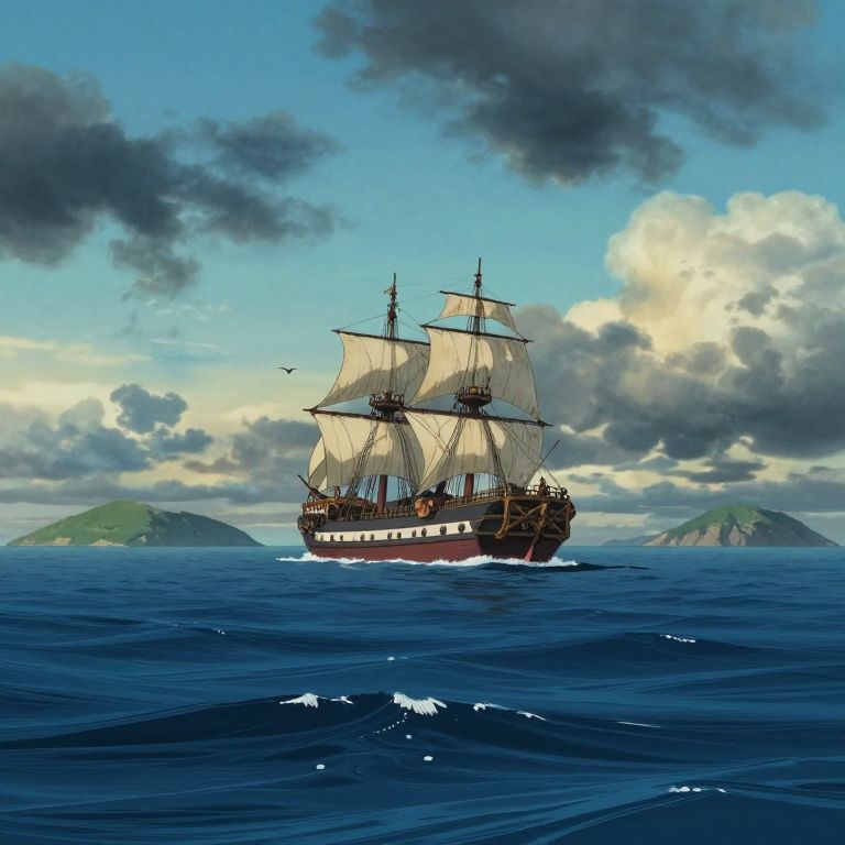 The image depicts a ship floating in the ocean, positioned between two islands. The ship, with its intricate details and weathered appearance, stands out against the vast expanse of the sea. The ocean's surface is a deep, rich blue, with gentle waves creating a sense of calm yet dynamic movement. The sky above is a mix of dark and light clouds, casting a dramatic and moody atmosphere over the scene. A single bird is seen flying in the distance, adding a sense of scale and life to the composition. The overall lighting is cinematic, with soft, diffused light highlighting the ship's structure and the ocean's texture, creating a visually striking and immersive scene reminiscent of Studio Ghibli's artistic style.