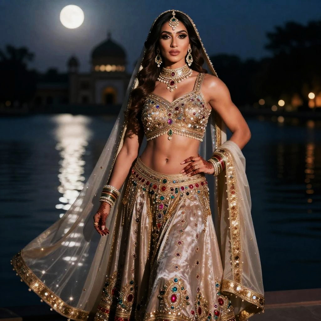Photograph of a beautiful South Asian woman in an ornate traditional bridal outfit, standing by a moonlit lake, with a temple in the background.