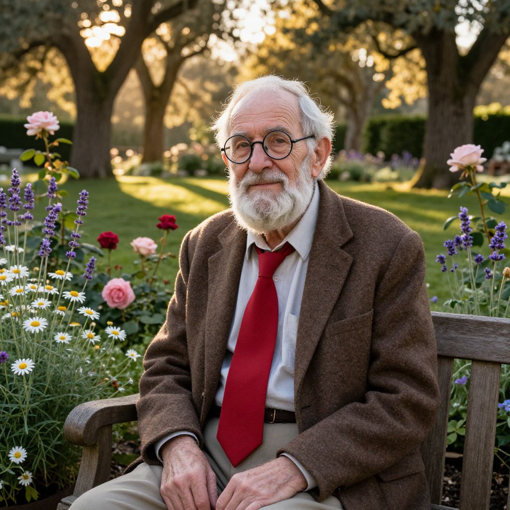 An old man with a white beard and round glasses, wearing a brown woolen jacket and a vibrant red tie, sits calmly in a sunlit garden, his hands resting on a wooden bench, with a gentle smile and a serene expression, surrounded by blooming flowers and soft golden sunlight filtering through the trees. He has kind, deep-set eyes that reflect calm wisdom, a slightly weathered face etched with the lines of time, and a peaceful demeanor that radiates quiet strength and warmth. The garden is lush and vibrant, with roses, daisies, and lavender in full bloom, creating a soothing, natural backdrop. The golden sunlight dapples through the tall oak trees, casting long, gentle shadows, and the air feels still and alive with the scent of fresh earth and flowers. The scene captures a sense of enduring wisdom, quiet contentment, and timeless peace.