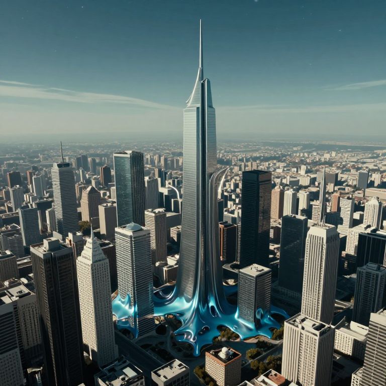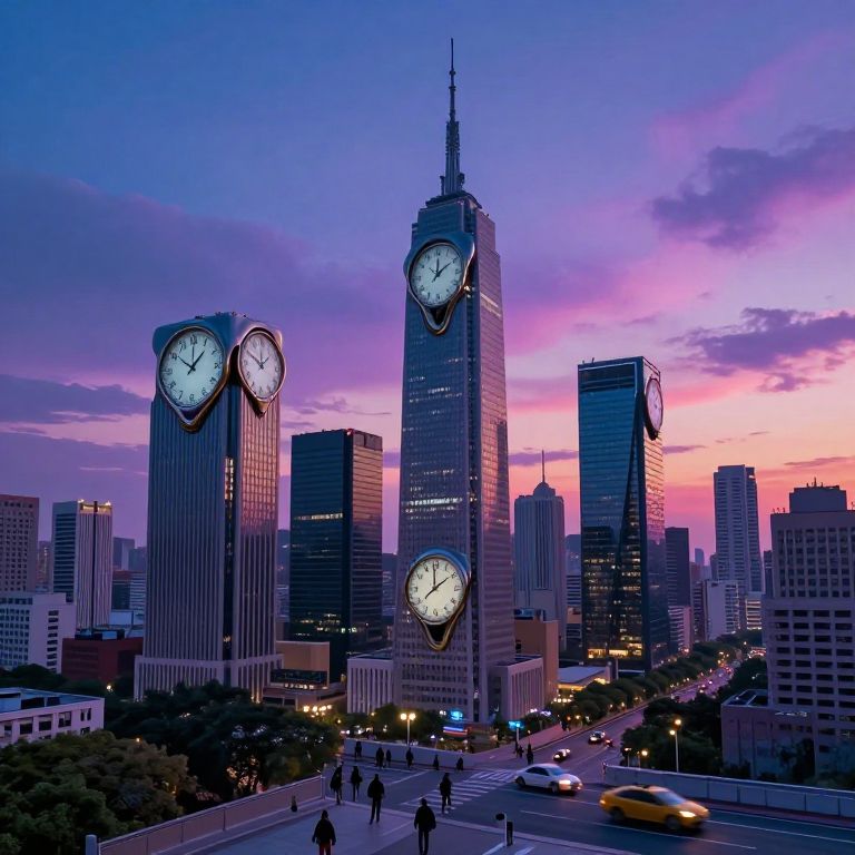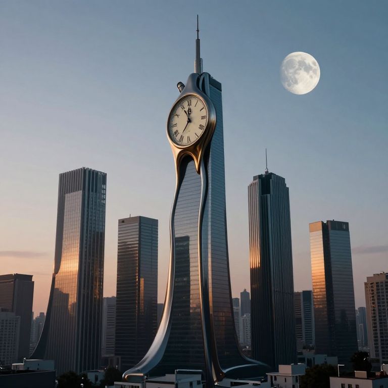 Craft an enigmatic digital artwork depicting a futuristic metropolis at twilight, where skyscrapers morph from rigid steel into fluid forms reminiscent of Dali-esque melting clocks. The scene should instill a blend of wonder and unease as the soft lunar glow casts elongated shadows across the malleable structures. Emphasize the interplay between light and shadow to generate an emotional spectrum that mirrors the perplexing essence of time. Introduce a suggestion of perpetual motion by delicately blurring the edges of the buildings, implying their dynamic equilibrium between solidness and liquidity.