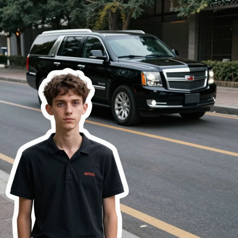 "Transfer Sticker scrawny reporter in foreground, far far in the background is a single black escalade, cinematic, being followed,"