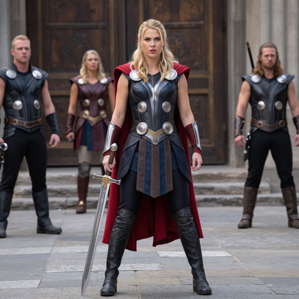 "Valkyrie Thor Ragnarok Costume, a woman dressed as thor and holding a sword in a scene"