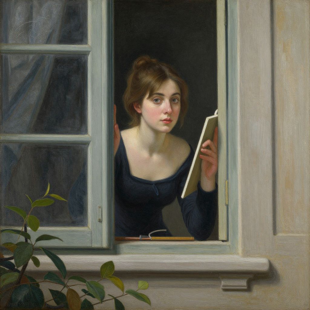 Photograph of a young white woman with fair skin and brown, wavy hair, wearing a light blue, long-sleeved dress with a white collar, seated at a wooden desk. She is focused on writing in an open notebook with a black pen in her right hand. The background is plain white, and she sits on a simple wooden chair. Her expression is calm and concentrated, with her gaze directed at the notebook. The image has a slightly painterly, digital enhancement effect, giving it a soft, slightly blurred appearance.