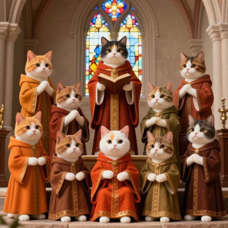 The image depicts a whimsical scene of a group of cats dressed in medieval attire, reminiscent of apostles in a church. There are nine cats in total, arranged in a hierarchical manner, with some standing on elevated platforms and others seated on lower levels. The cats are adorned in rich, colorful robes, with varying shades of orange, brown, and white. The central cat, positioned on a raised platform, holds an open book, suggesting a role of leadership or importance. The background features an arched window with stained glass, adding to the church-like atmosphere. The overall composition is balanced, with the cats evenly distributed across the scene, creating a sense of unity and order. The interplay of colors, textures, and shapes enhances the visual appeal, making the image both charming and intriguing.
