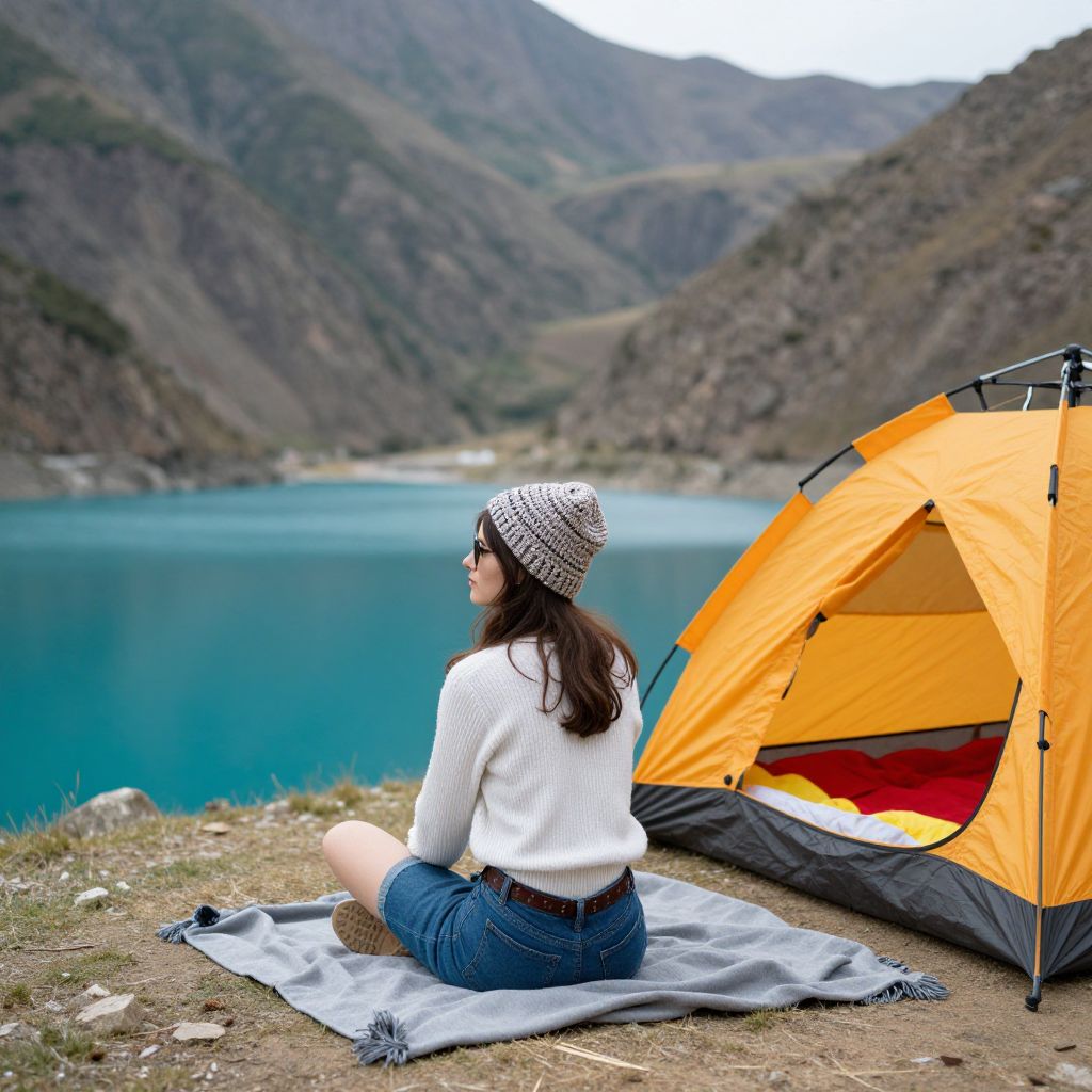 Photograph of a young woman with long brown hair, wearing a white knit beanie, striped crop top, and high-waisted blue denim shorts, sitting on a gray blanket beside an orange and yellow tent by a turquoise lake. She faces away, gazing at the mountainous landscape with steep, green-covered slopes and a cloudy sky. The tent has black accents and is pitched on a grassy, rocky terrain. The image conveys a serene, outdoor camping scene.