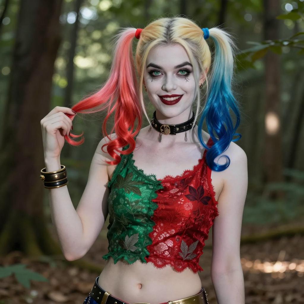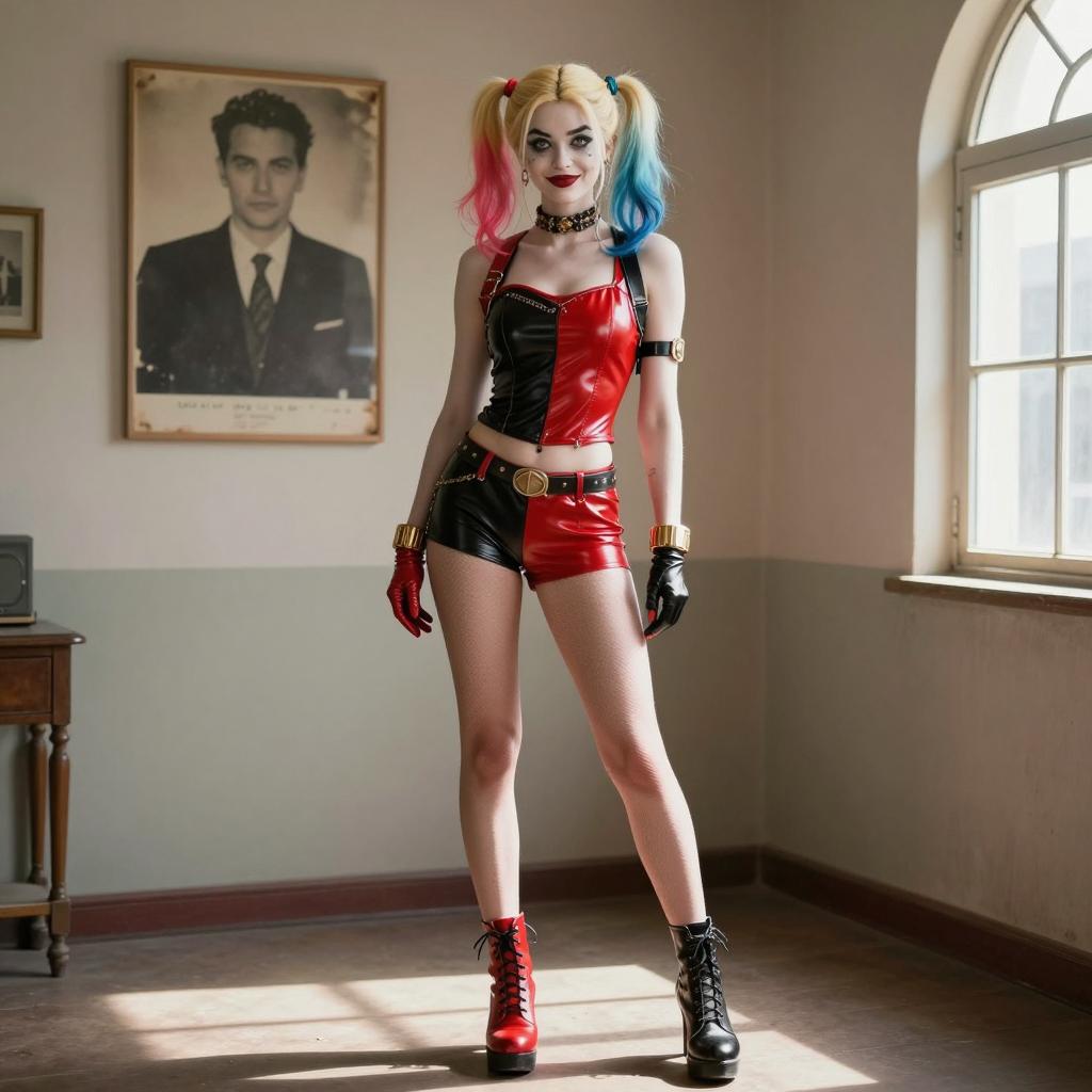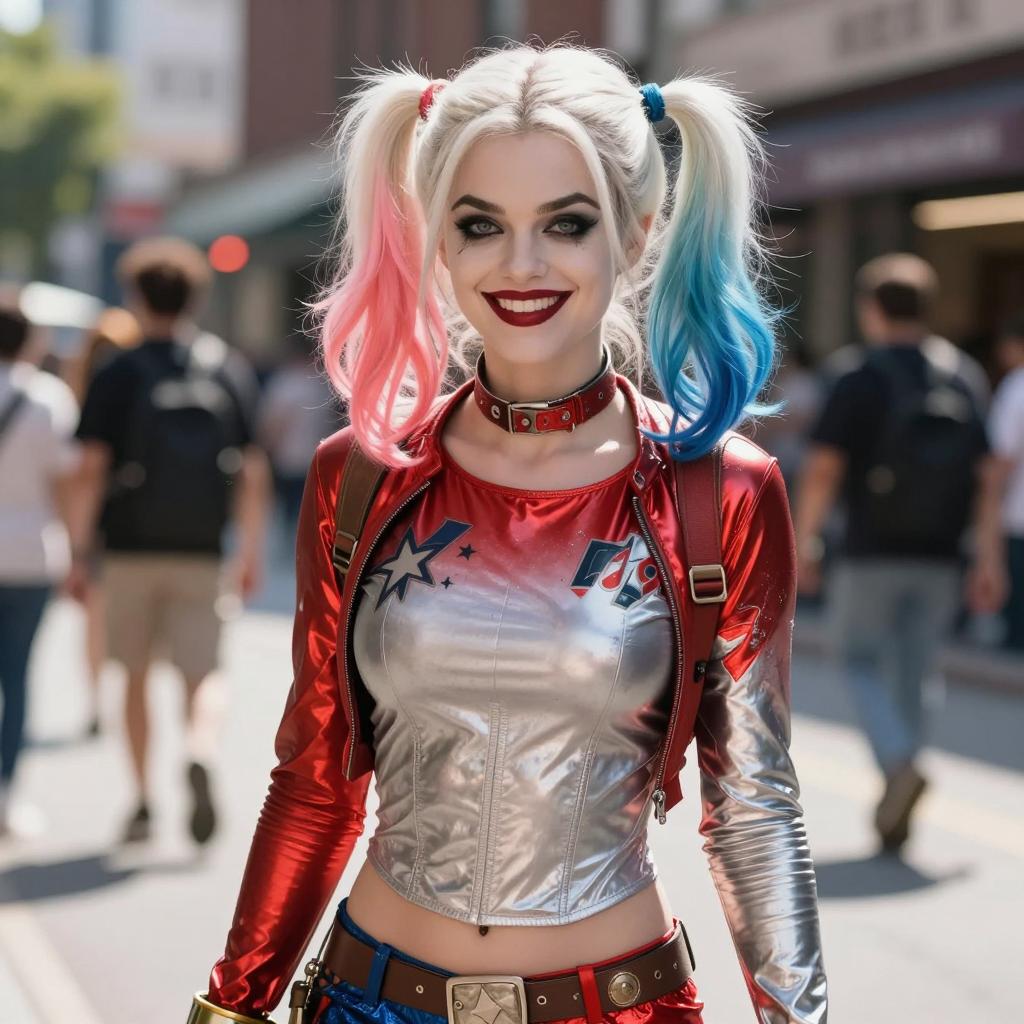 Photorealistic image of a young woman dressed in Harley Quinn cosplay, featuring golden overalls, a white tank top with pink trim, a red choker, and blonde hair in pink and blue pigtails. She is smiling and standing in front of a colorful graffiti wall during daytime. The image captures a vibrant, comic book style with bright colors and detailed textures.