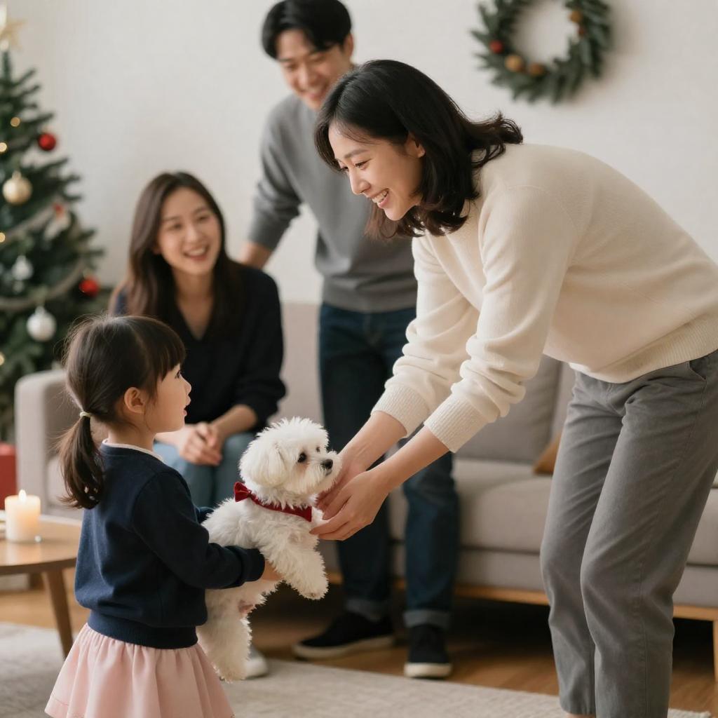 Photograph of an Asian woman with long black hair and blue scarf, smiling while interacting with two small dogs, one black and one white, in a pet store. She holds a red toy, standing beside a cat tree. Shelves in the background are filled with pet supplies and toys.