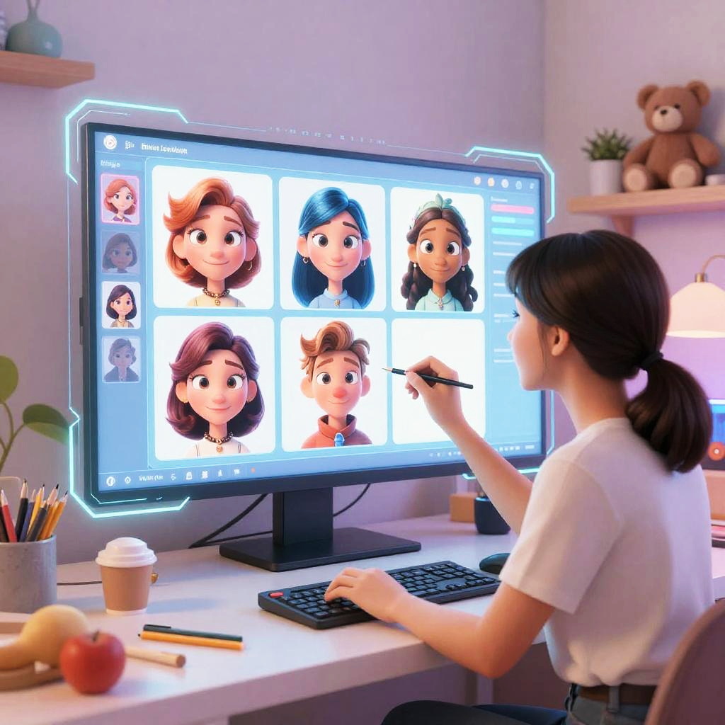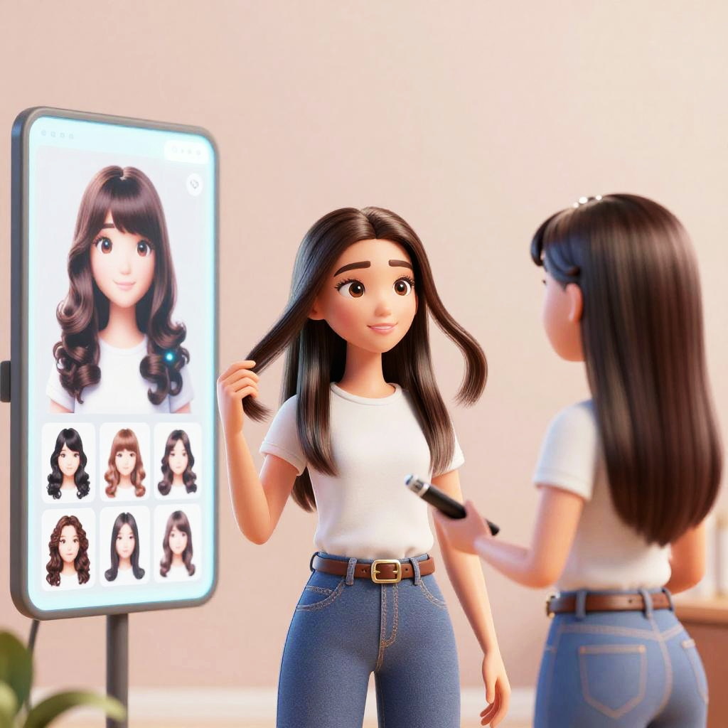 Online makeover hair design, animated woman exploring new hairstyles in 3D space, sleek holographic displays with hair pattern options, professional and creative ambiance, soft pastel background