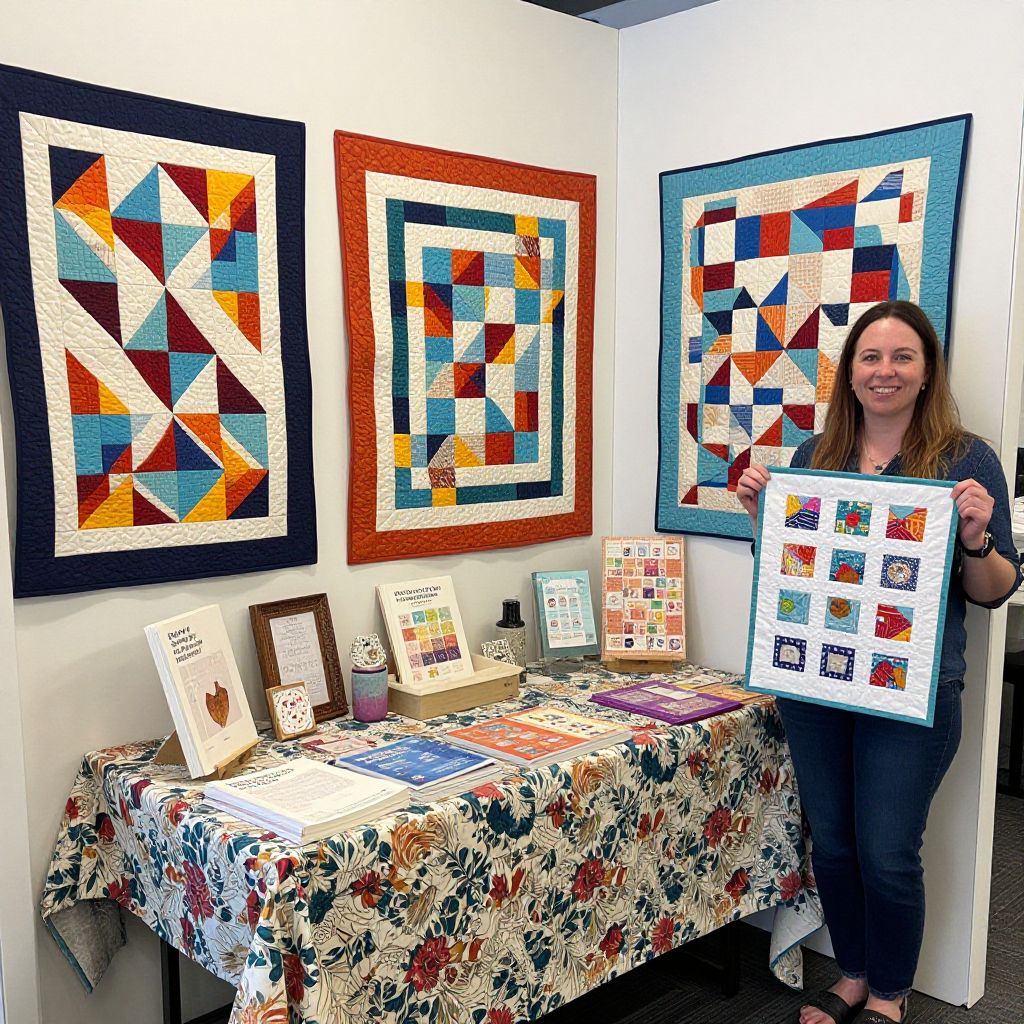 Craft fair booth featuring a vibrant quilt display with three colorful quilts mounted on walls, a floral-patterned tablecloth covering a table with books and decorative items, and a smiling woman standing to the right, showcasing her handcrafted designs.