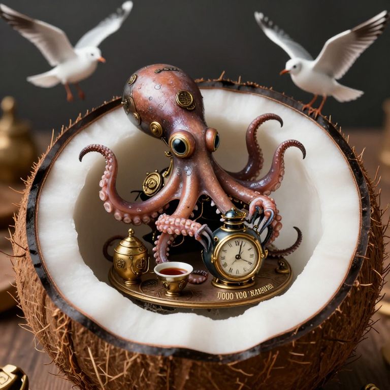 Inside an inverted coconut, a steampunk octopus with gilded inkpods prepares a 1000-year-old tea ceremony for talking clockwork seagulls.