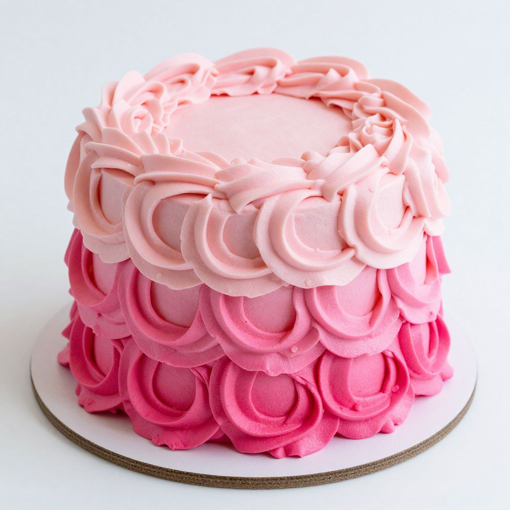 A beautifully crafted ombre rosette cake, transitioning from vibrant hot pink at the base to delicate light pink at the top, showcases a seamless gradient effect, perfect for a woman's birthday celebration, rendered in high-definition detail with a soft, pastel aesthetic.