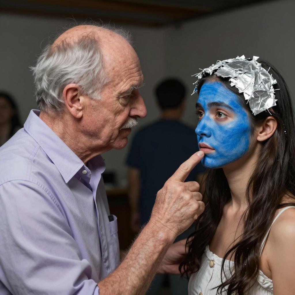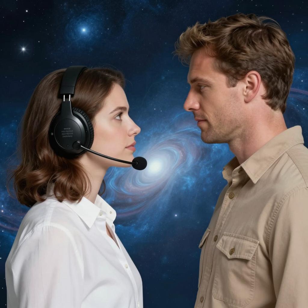 A man with dark, slightly messy hair wearing a light blue button-up shirt adjusts the headphones on a young woman with brown hair and a purple t-shirt. The woman has a neutral expression and stands in a dimly lit room with several blurred individuals in the background.