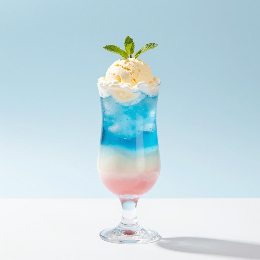 Photograph of a tall, clear glass with a blue gradient liquid, topped with a white scoop of ice cream and a green mint leaf. A silver spoon rests on a clear saucer in the foreground. Blue gradient background.