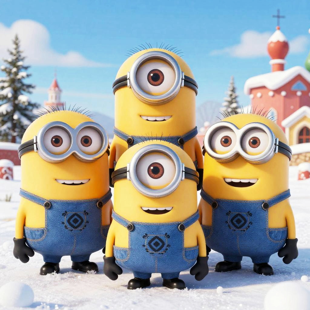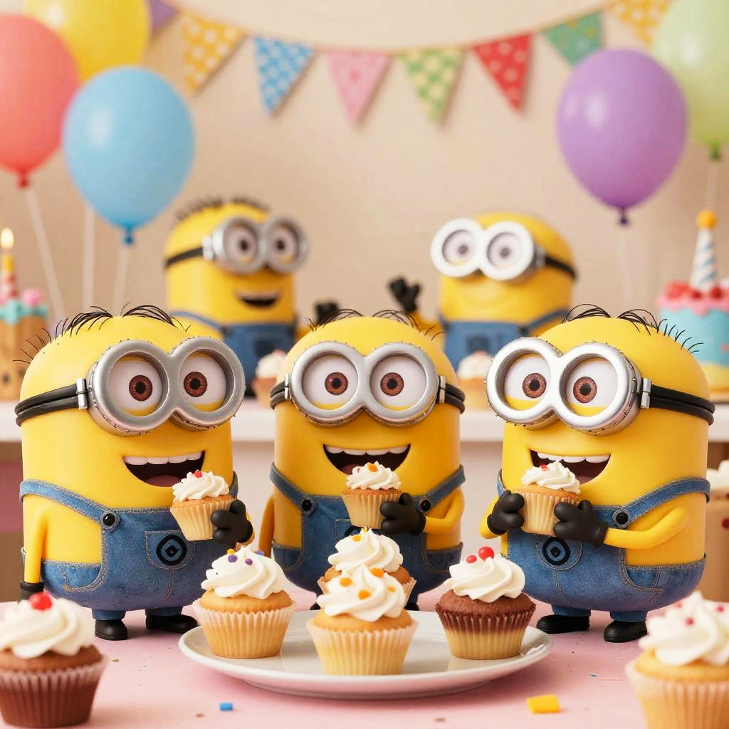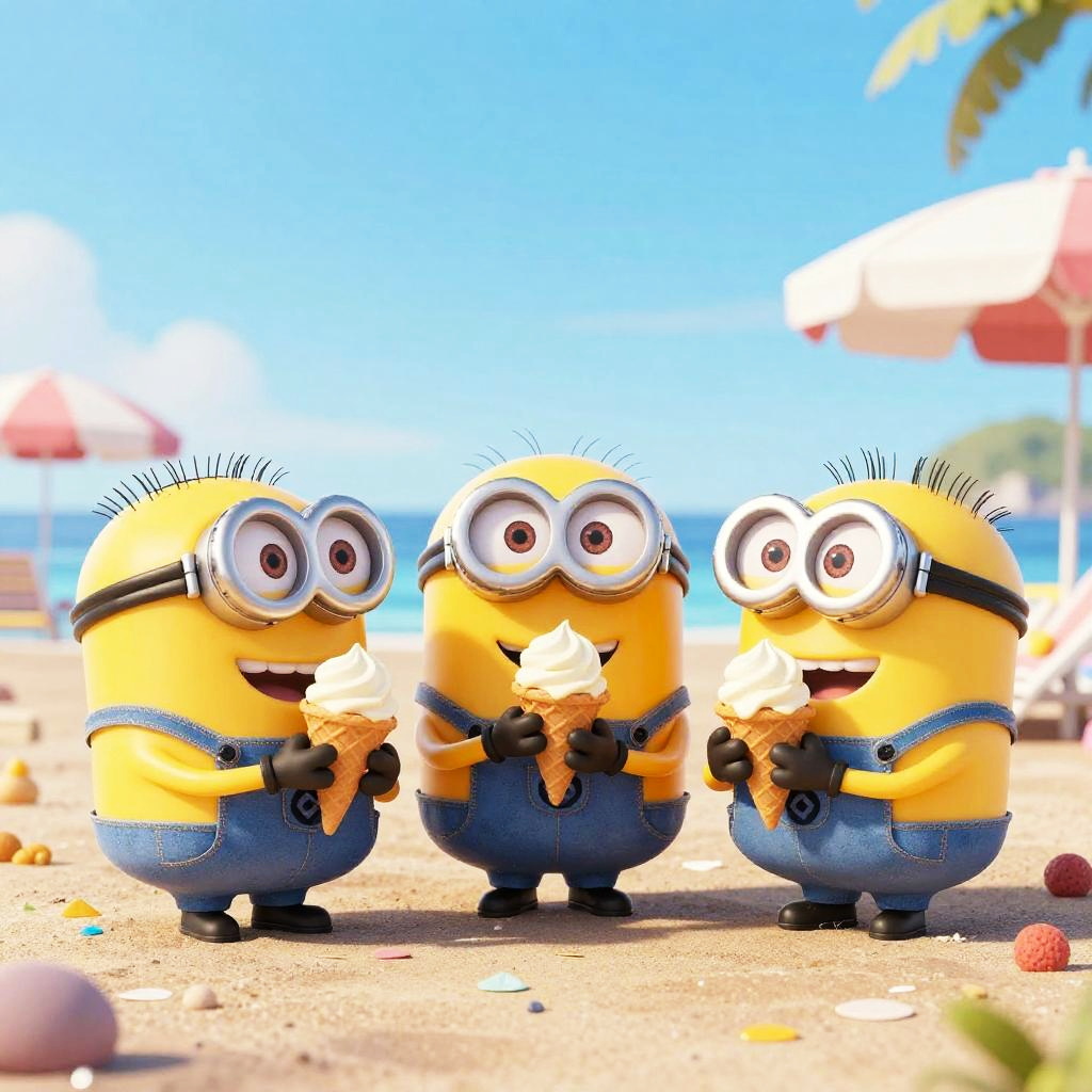 Minions eating ice cream cones on a sunny beach, cheerful and fun atmosphere, soft pastel colors, intricate textures, playful cartoon scene