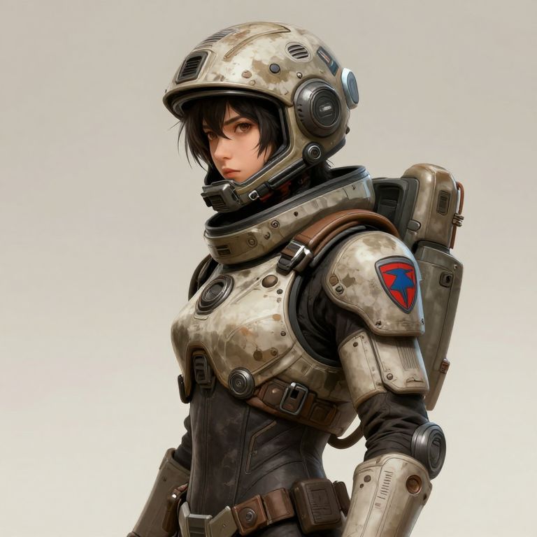 The image depicts a character in a futuristic, tank girl-inspired space suit, rendered in a style reminiscent of Jamie Hewlett's art. The character is wearing a helmet adorned with various stickers and decals, giving it a rugged, battle-worn appearance. The suit is detailed with patches and insignias, including a prominent red and blue emblem on the right arm. The character's dark hair is styled in a short, tousled manner, adding to the rugged, combat-ready look. The overall color palette is neutral, with shades of brown, beige, and black dominating the scene, creating a sense of realism and depth. The background is plain, ensuring the focus remains on the character and their detailed attire. The composition is dynamic, with the character positioned in a side view, showcasing the full torso and the intricate details of the suit and helmet. The lighting is natural, highlighting the textures and contours of the character's attire, enhancing the three-dimensional effect.