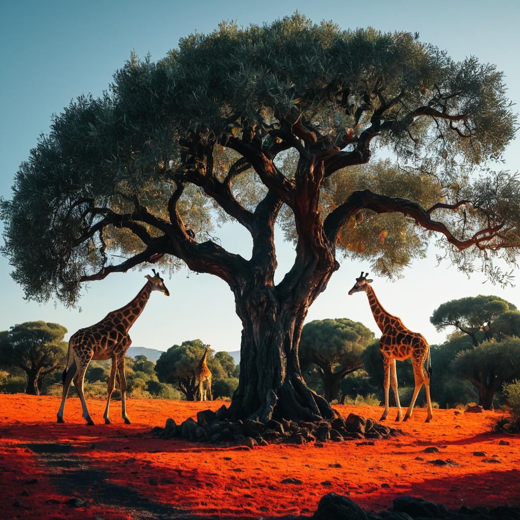 A hyper-realistic scene depicting a large ancient olive tree with broad, intricate branches illuminated by warm sunlight. The ground features striking fiery red tones mimicking lava rock textures, contrasting with vibrant green foliage in the background. Three giraffes with patterned coats are gracefully positioned around the tree under a clear midday sky, creating a mystical, vibrant atmosphere.