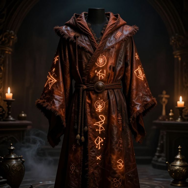 Ancient wizard robe made of worn leather and enchanted silk, covered in arcane symbols, glowing softly in a dark, candlelit chamber filled with magical artifacts, smoky atmosphere, detailed textures, mystic and mysterious mood.